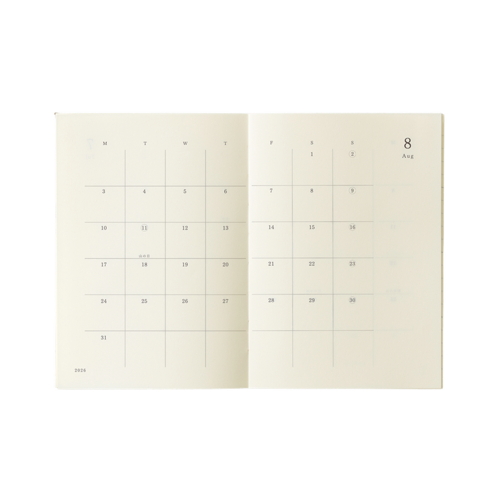 De Midori MD Notebook Diary A6 2026 is een minimalistische en veelzijdige planner voor wie graag overzicht houdt, maar ook vrijheid wil om zelf te schrijven en plannen. Voorin vind je overzichtelijke maandspreads van december 2025 t/m januari 2027. Daarna volgen gelinieerde pagina’s met een horizontale 8-vaksindeling, perfect om zelf wekelijkse spreads te maken. Achterin is er extra ruimte op blanco pagina’s voor notities, ideeën of schetsen.