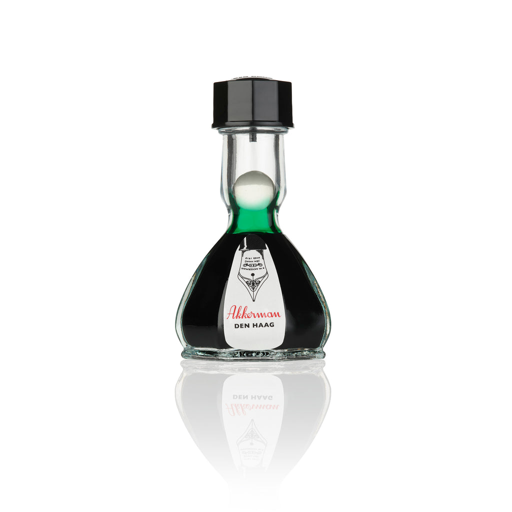 De gefacetteerde inktflacon wordt gekenmerkt door de lange hals waarin zich een glazen knikker bevindt. Akkerman vulpeninkt is geschikt voor elk type vulpen en beschikbaar in 31 sprankelende kleuren. De inktkleuren hebben Haags getinte namen meegekregen