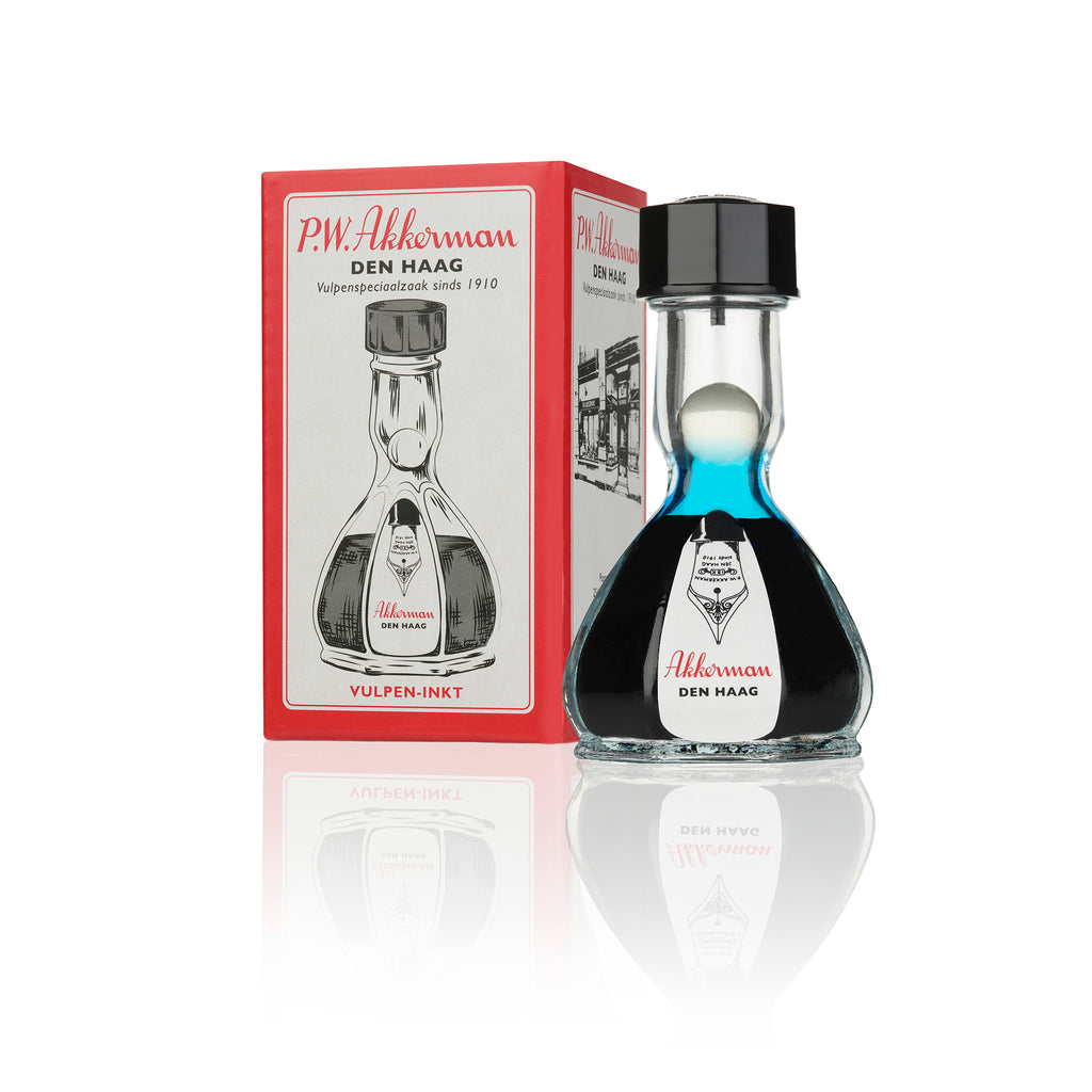 De gefacetteerde inktflacon wordt gekenmerkt door de lange hals waarin zich een glazen knikker bevindt. Akkerman vulpeninkt is geschikt voor elk type vulpen en beschikbaar in 31 sprankelende kleuren. De inktkleuren hebben Haags getinte namen meegekregen