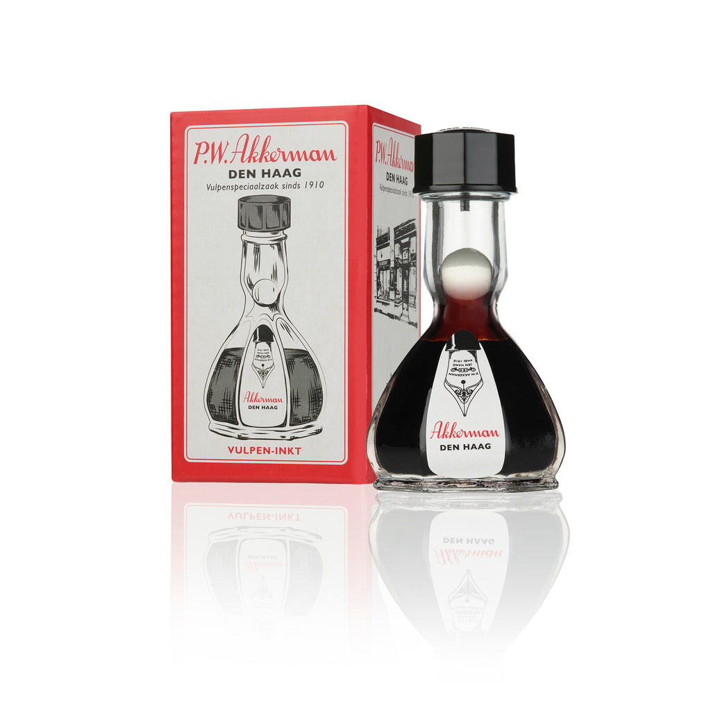 De gefacetteerde inktflacon wordt gekenmerkt door de lange hals waarin zich een glazen knikker bevindt. Akkerman vulpeninkt is geschikt voor elk type vulpen en beschikbaar in 31 sprankelende kleuren. De inktkleuren hebben Haags getinte namen meegekregen